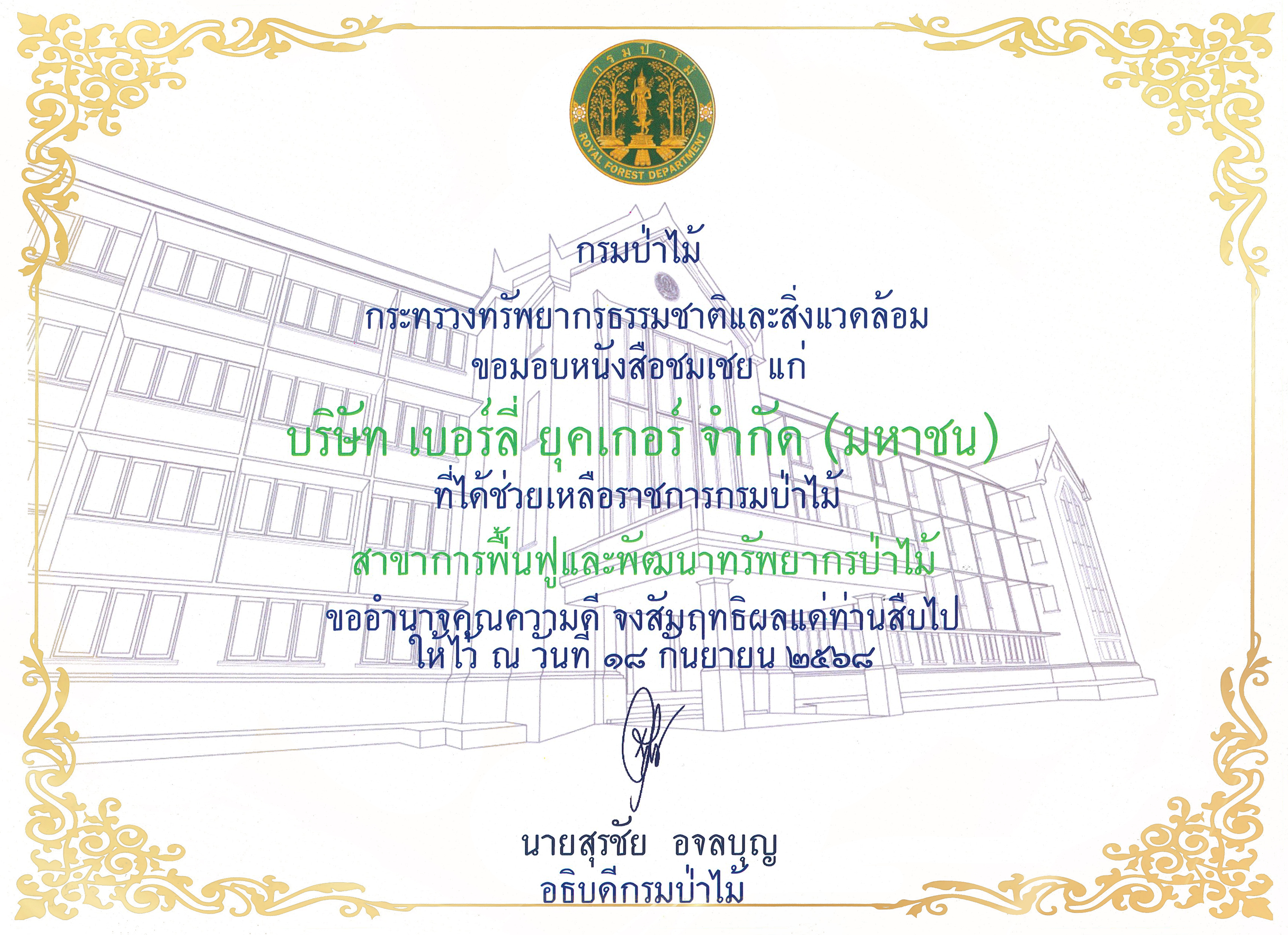บริษัท เบอร์ลี่ ยุคเกอร์ จำกัด (มหาชน) หรือ บีเจซี เข้ารับหนังสือชมเชย สาขาการฟื้นฟูและพัฒนาทรัพยากรป่าไม้ จากกรมป่าไม้ ในพิธีวันสถาปนากรมป่าไม้ ครบรอบ 129 ปี ในฐานะหน่วยงานและองค์กรที่มีส่วนร่วมสนับสนุนการอนุรักษ์ ฟื้นฟู และพัฒนาทรัพยากรป่าไม้ของประเทศอย่างต่อเนื่อง เป็นผู้ช่วยเหลือราชการกรมป่าไม้ประจำปี 2568 โดยมี นางวิภาดา ดวงรัตน์ รองประธานกรรมการบริหารคนที่ 1 เป็นผู้แทนกลุ่มบีเจซี บิ๊กซี เข้ารับรางวัลอันทรงเกียรติจาก ดร. ชญานันท์ ภักดีจิตต์ ปลัดกระทรวงทรัพยากรธรรมชาติและสิ่งแวดล้อม เมื่อวันที่ 18 กันยายน 2568 ณ อาคารเทียมคมกฤส กรมป่าไม้