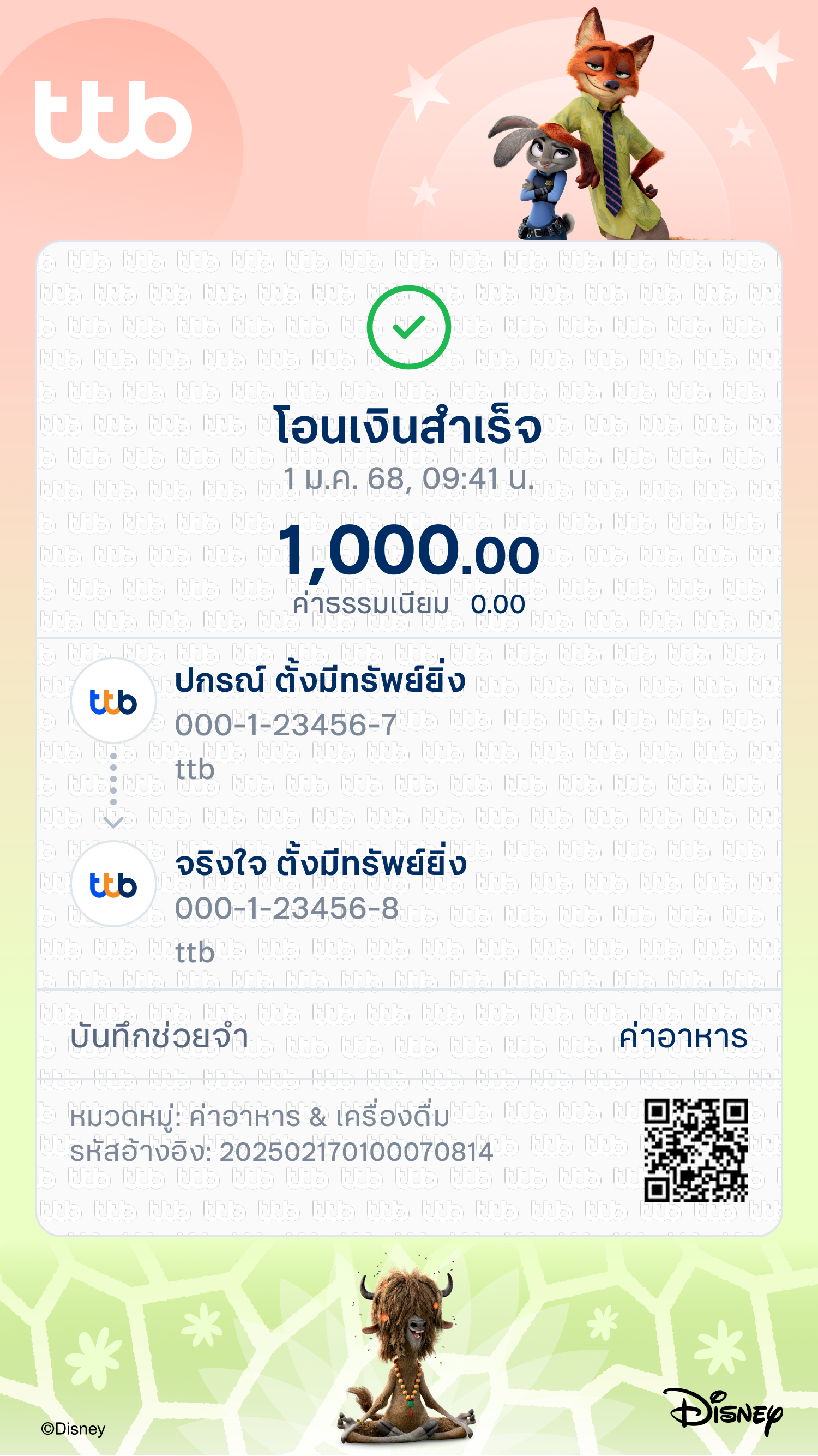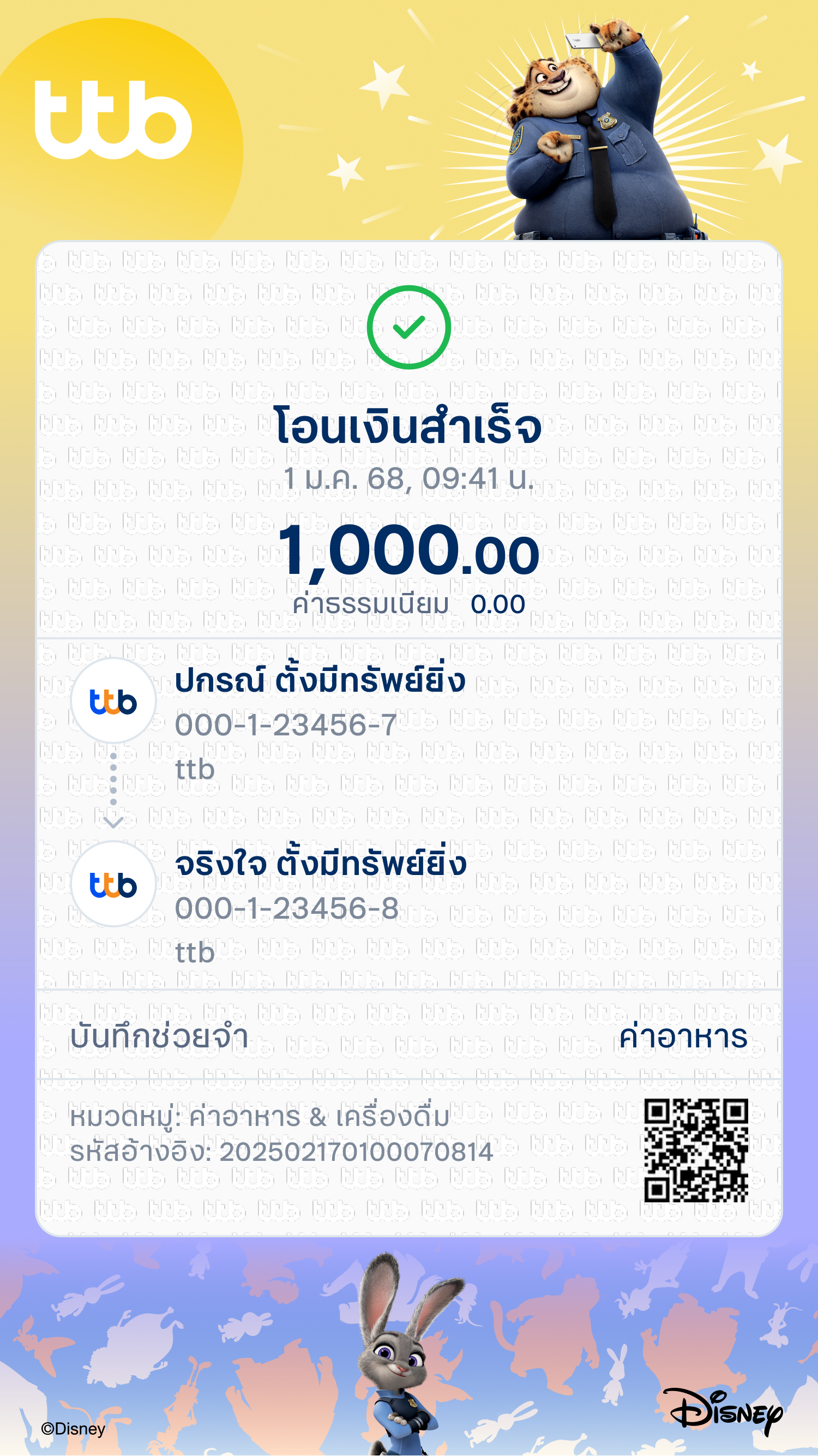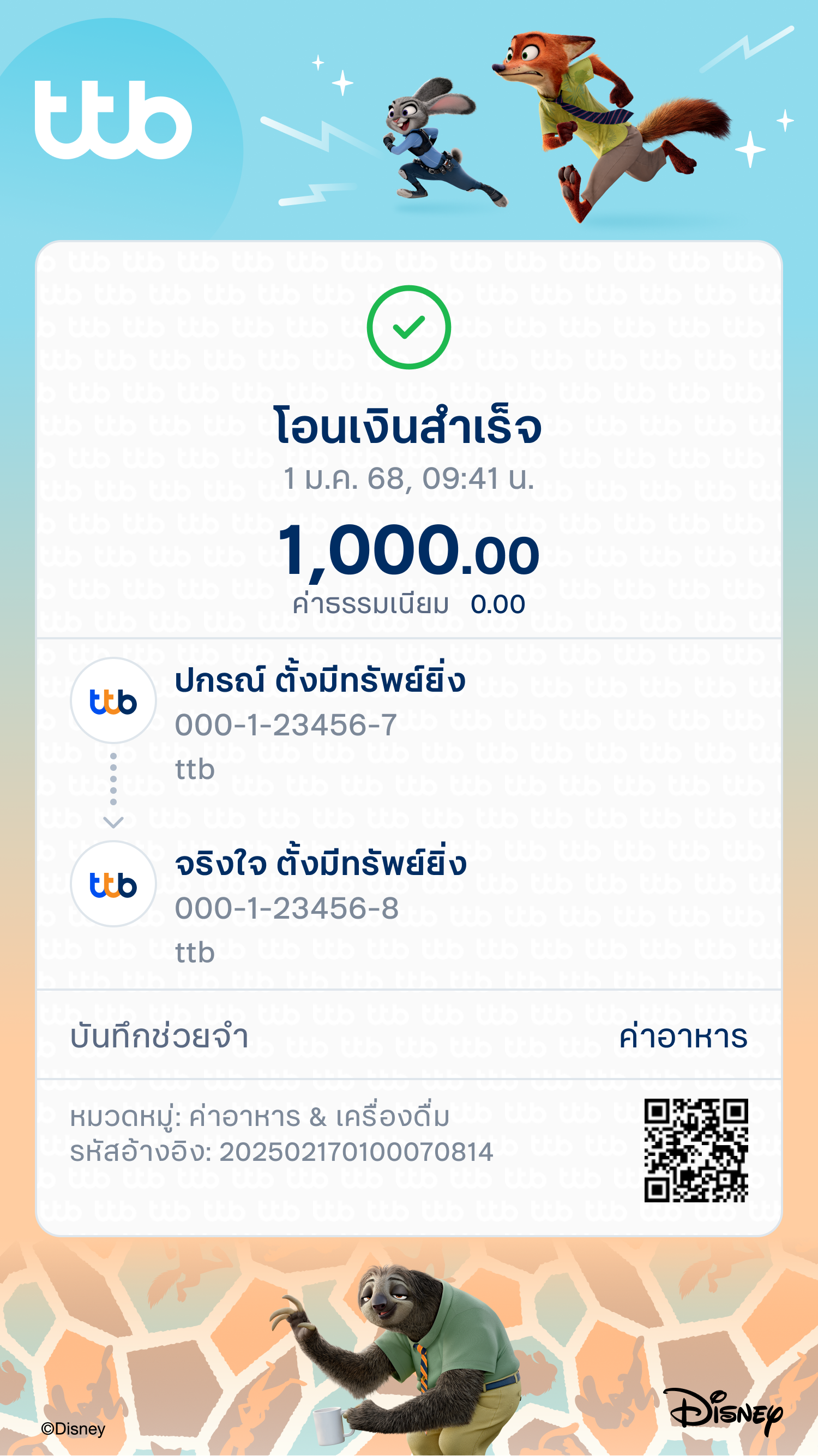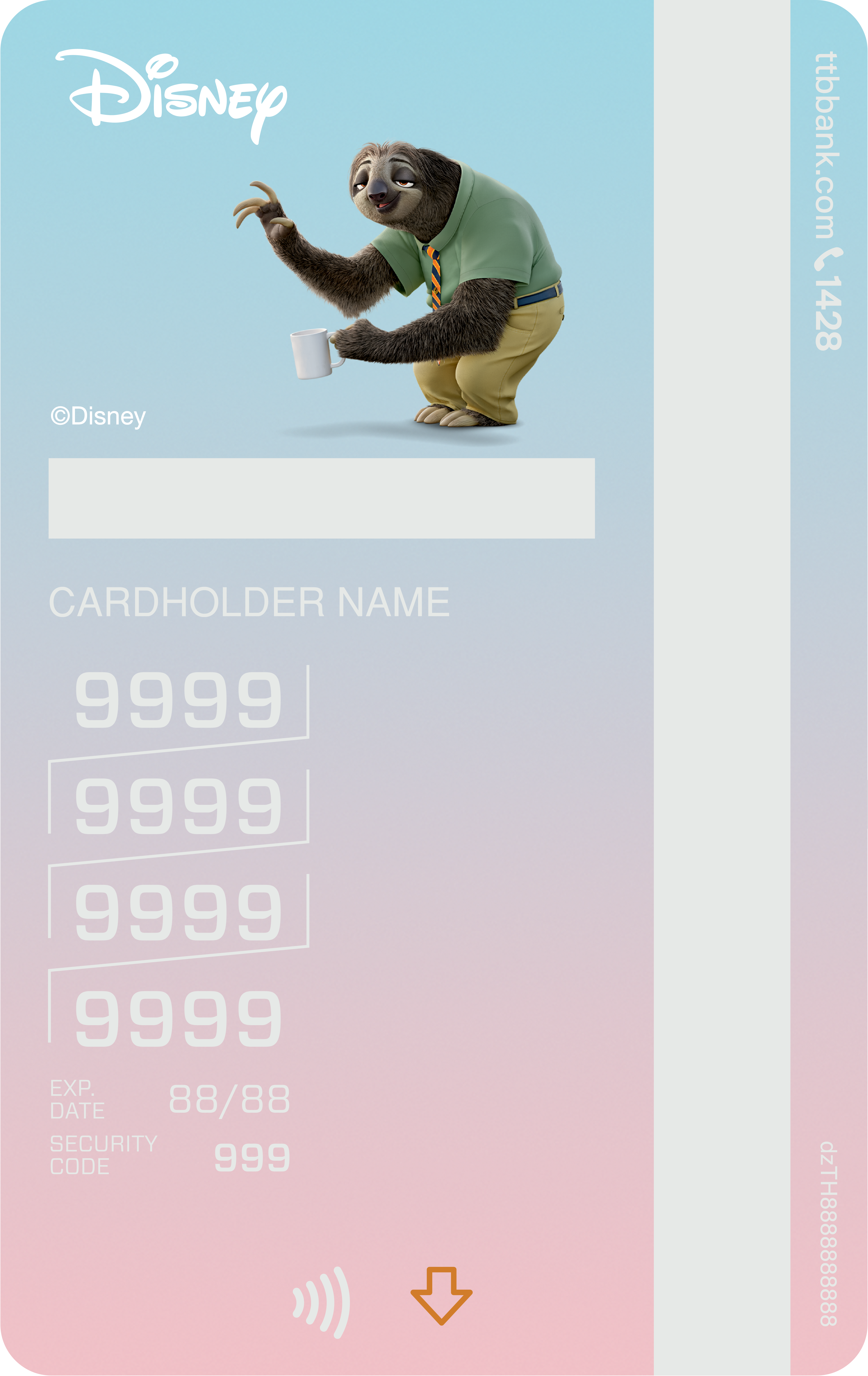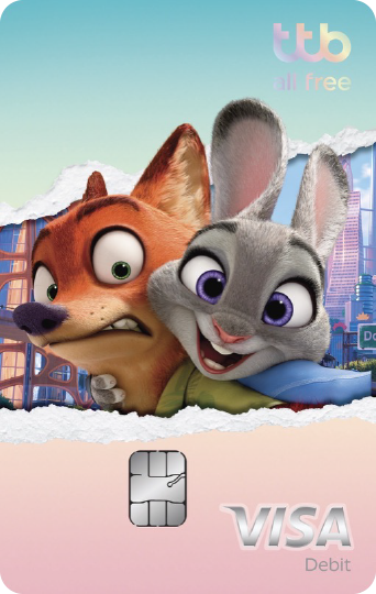 บัตรเดบิต ทีทีบี ออลล์ฟรี ดิสนีย์ ลายใหม่ “Zootopia Limited Edition” ดีไซน์พิเศษนำ 2 คาแรกเตอร์หลักจากภาพยนตร์เรื่อง Zootopia มาใช้ในการออกแบบ พร้อมด้วยสีสันที่ถ่ายทอดความสนุก และความหลากหลายของตัวละครบนหน้าบัตรในแบบที่เหมาะกับไลฟ์สไตล์คนรุ่นใหม่ ทั้งกลุ่มวัยเรียน วัยทำงาน และแฟนดิสนีย์ที่ต้องการบัตรเดบิตลายน่ารัก ใช้งานได้จริงและคุ้มค่า ซึ่งมาพร้อมกับ e-Slip 3 ลายพิเศษที่มีตัวคาแรกเตอร์จากภาพยนตร์เรื่องZootopia ยกทัพมาทั้งแก๊งเพื่อสร้างรอยยิ้มในทุกการทำธุรกรรมทางการเงิน