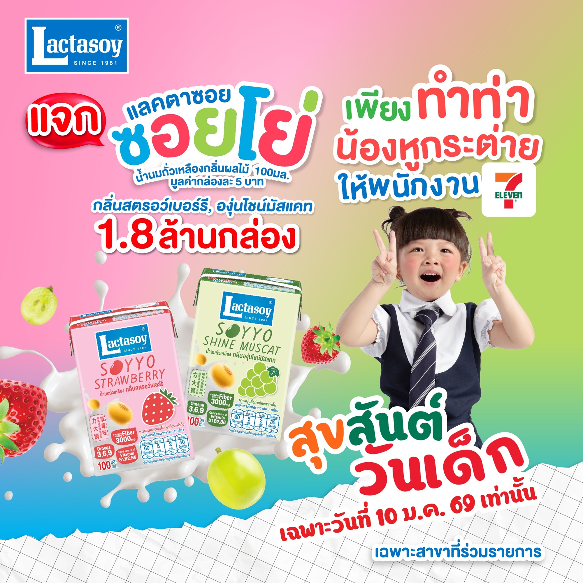 สุขสันต์วันเด็ก แลคตาซอย ใจดี แจกใหญ่ แจกจริง! ส่งความสุขให้เด็กไทยในวันเสาร์ที่ 10 มกราคม 2569 นี้ กับแคมเปญสุดพิเศษมอบ “แลคตาซอย ซอยโย่” นมถั่วเหลืองผสมกลิ่นผลไม้ สตรอว์เบอร์รี่ หวานละมุน และองุ่นไซมัสแคท หอมชื่นใจ ขนาด 100 ml. จำนวน 1,800,000 กล่อง ที่ 7-Eleven เพียงแค่น้องๆ หนูๆ ทำท่า “น้องหูกระต่าย” ชูสองนิ้วไว้ที่หูสองข้างให้พี่พนักงานที่เคาน์เตอร์ดู ก็รับแลคตาซอย ซอยโย่ ฟรีๆ กันไปเลย อย่ารอช้านะ ใกล้ 7-Eleven สาขาไหน รีบพุ่งตัวไปรับความอร่อยและสุขภาพดีกันได้เลย เฉพาะสาขาที่ร่วมรายการ สินค้ามีจำนวนจำกัด 1คน / 1 กล่อง เท่านั้น