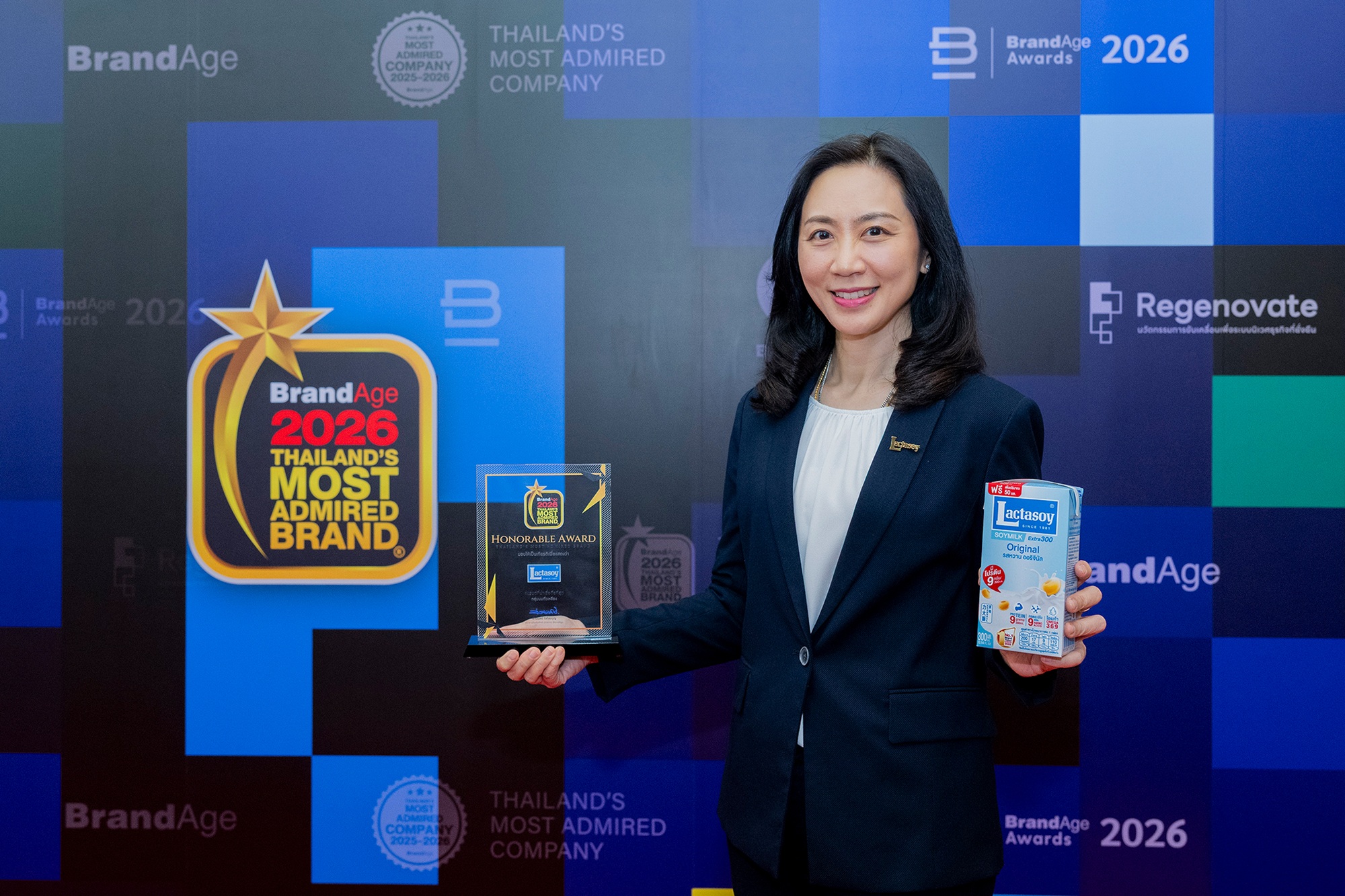 บริษัท แลคตาซอย จำกัด ผู้ผลิตและจำหน่ายผลิตภัณฑ์นมถั่วเหลือง “แลคตาซอย” นำโดย นางสาวมัลลิกา จิรพัฒนกุล ผู้จัดการใหญ่ฝ่ายขาย รับรางวัล “2026 Thailand’s Most Admired Brand” หมวดสินค้าบริโภคกลุ่มนมถั่วเหลือง จากการสำรวจโดยนิตยสาร BrandAge ซึ่งจัดขึ้นเพื่อสะท้อนความเชื่อมั่นและความไว้วางใจของผู้บริโภคที่มีต่อแบรนด์ชั้นนำในประเทศไทย