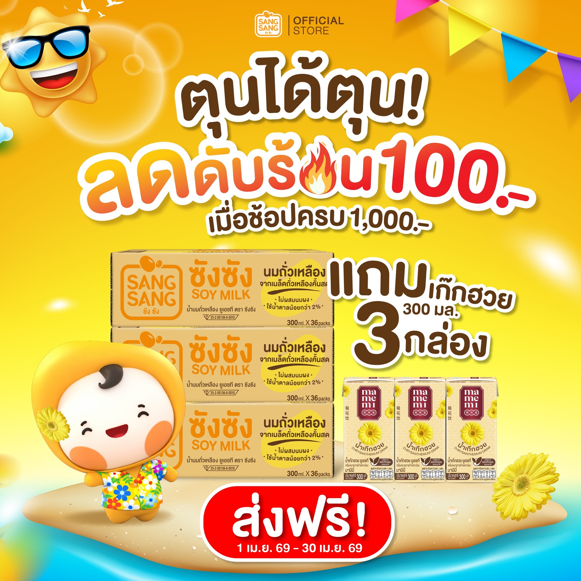 ซัมเมอร์นี้ “ซังซัง” นมถั่วเหลืองหวานน้อย อร่อยหอมมัน ปล่อยโปรโมชันดับร้อนต้อนรับเดือนเมษายน 2569 เตรียมตุนได้แบบไม่ยั้ง เมื่อช้อปครบ 1,000 บาท ลดทันที 100 บาท แถมเสิร์ฟความสดชื่นฟรี “มามีมี่ น้ำเก๊กฮวย” ขนาด 300 มิลลิลิตร อีก 3 กล่อง คุ้มแบบ x2 ร้อนแค่ไหนก็เอาอยู่ ตั้งแต่วันนี้ถึง 30 เมษายน 2569 อย่ามัวรอช้า รีบมากดตุนกันได้ที่ https://www.lactasoyshop.com/product-category/sangsang